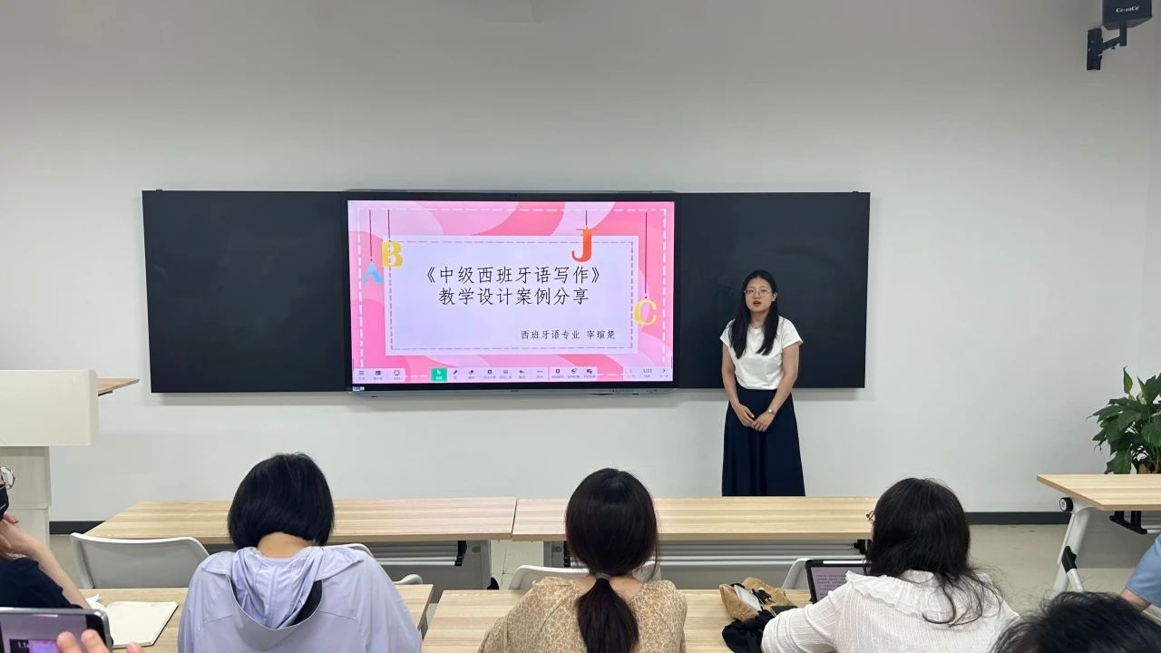 最后,西班牙语专业的宰瑄楚老师展示了《中级西班牙语写作》课程的教学设计。宰瑄楚老师的教学设计采用POA(产出导向法)教学理念,通过“驱动-促成-评价”的教学流程设计驱动任务,引导学生在实际应用中不断实践和改进写作能力。这一系统化的教学流程,不仅提高了学生的写作能力,还培养了学生的自主学习和反思能力。活动的最后,吴震进行了总结发言。她高度评价了三位教师的教学设计,并指出教学设计的核心在于“设计”,即通过精心的规划和安排,使教学活动更具针对性和有效性。她强调,教师应不断探索和创新教学方法,注重学生的全面发展和个性化培养。