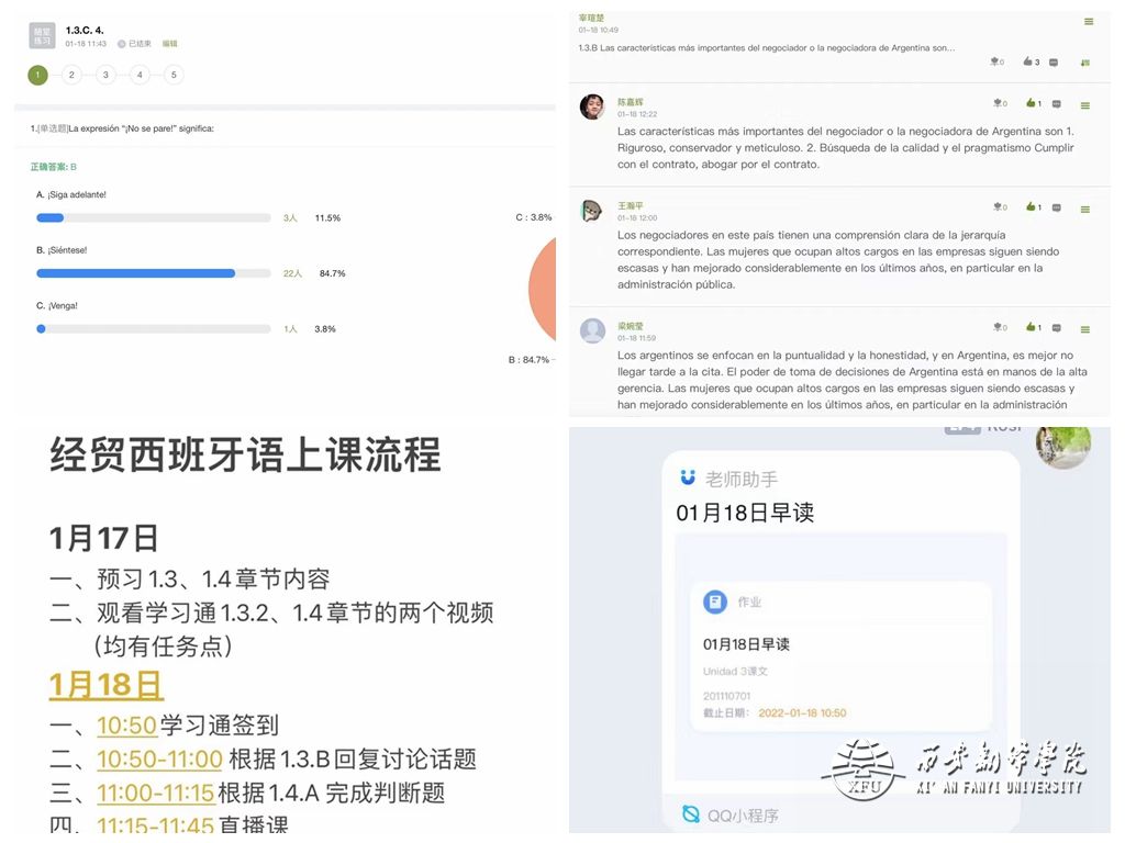 近日,beat365中文官方网站西班牙语专业课程第二周线上教学圆满结束。在总结前期授课过程中遇到的问题的基础上,西班牙语教研室各专业老师本周继续整合课程资源、灵活调整教学方案,采取将部分学习任务安排至课前,以录播+练习+直播答疑等方式开展线上教学,亮点突出,效果显著。