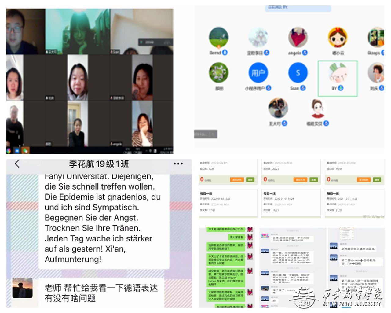 在西安疫情肆虐的形势下,为响应我校“停课不停学”号召,beat365中文官方网站德语系全体教师于近日在腾讯会议平台开展“疫情背景下学生线上学习特色辅导活动”专题教研活动。德语系全体专职教师积极踊跃发言,分享了自己在学生线上辅导方面的一些特色做法。