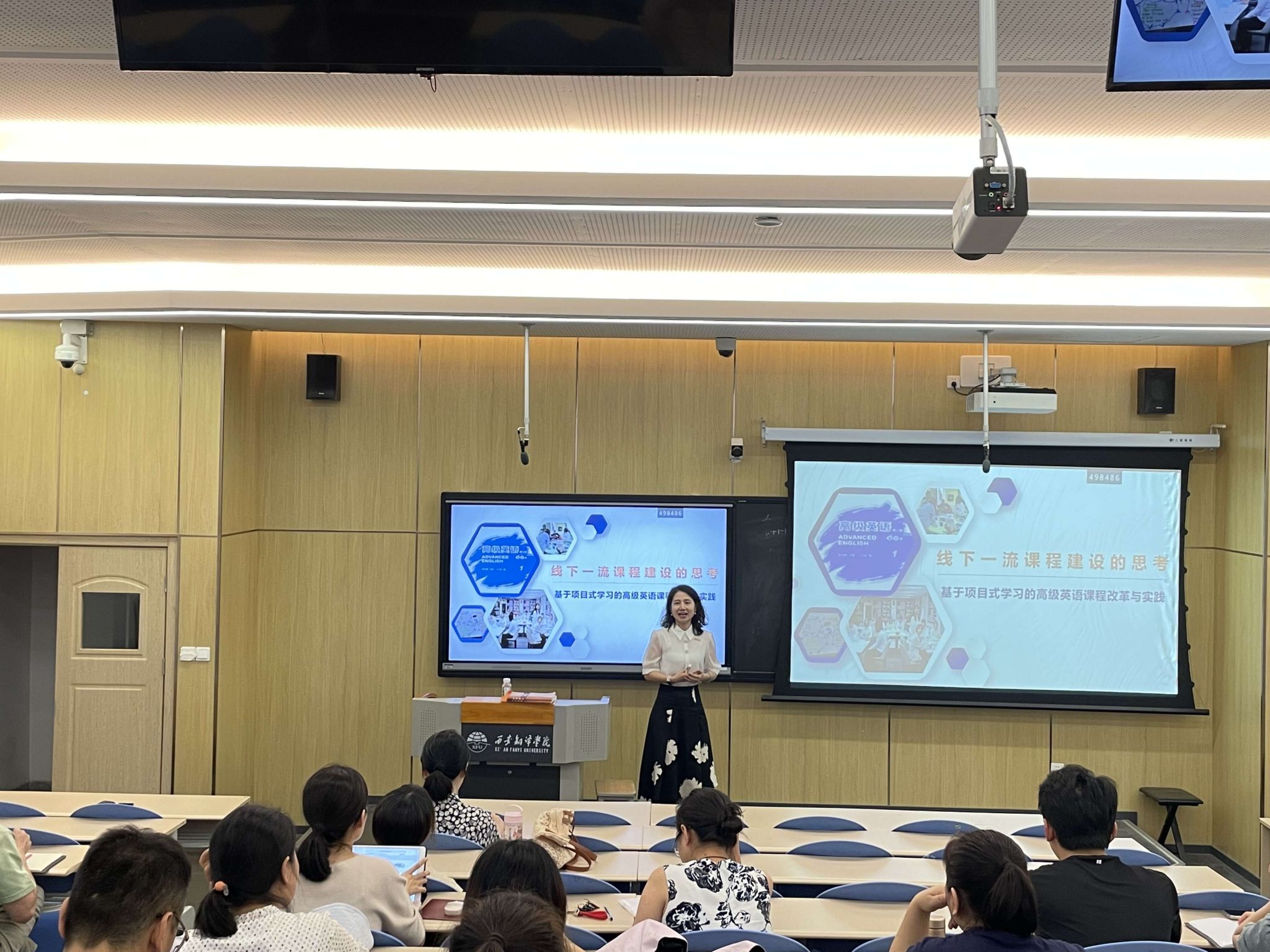 7月12日上午,beat365中文官方网站邀请教务处处长秦晓梅作题为“线下一流课程建设的思考——基于项目式学习的高级英语课程改革与实践”讲座。beat365中文官方网站全体教师参加讲座,学院副院长吴震主持讲座。