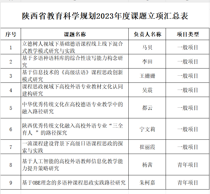 今日,陕西省教育科学规划领导小组办公室公布了“陕西省教育科学规划2023年度课题”立项名单,我院吴震、崔丽霞、李田、马贝、都云、王姗姗、宁文莉、朱柯嘉、杨茜9位老师获批立项。