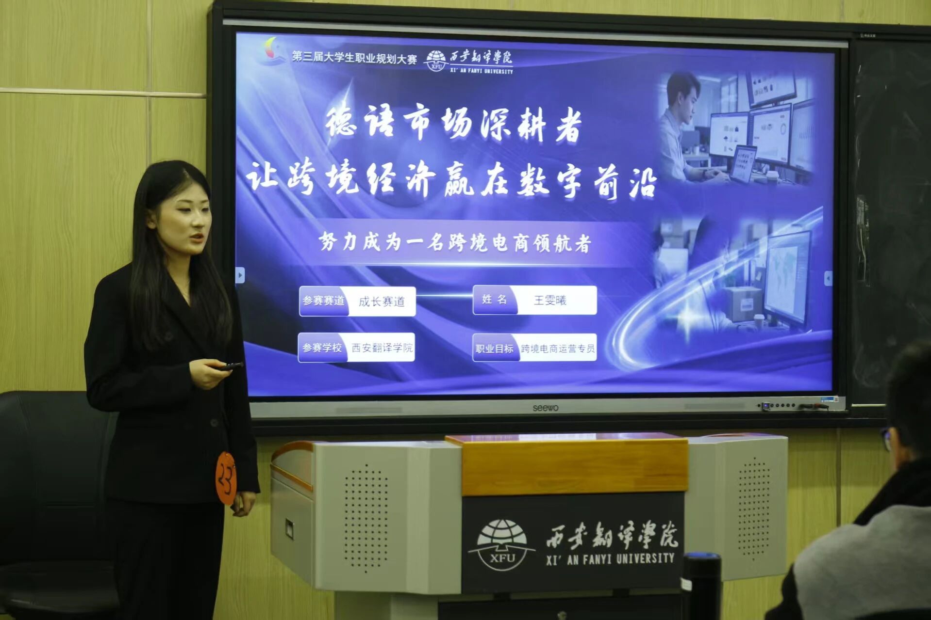 在成长赛道中,23名参赛选手结合专业特色,通过生涯发展报告展示,娓娓道来他们对语言与文化领域的深刻理解与热爱,描绘出清晰而充满希望的未来职业蓝图。他们的陈述或激情澎湃,或理性沉稳,展现了语言学子扎实的专业功底与远大的职业理想。