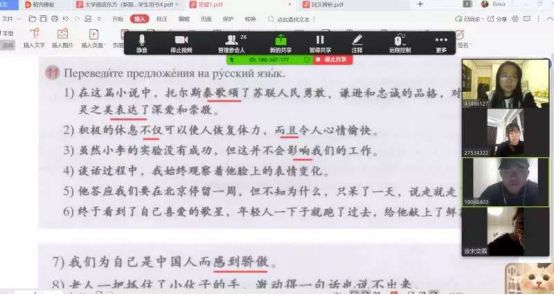 老师们克服重重困难,在摸索中不断前进。比如:法语系学术带头人史晓琴教授,本着对学生、对课堂负责的精神,开课前反复推敲、反复尝试各种平台的直播效果,并克服无教材、无资料等不利因素,为每课制作精美的PPT课件,圆满完成了线上授课的全部课前准备工作。教坛新秀李娅、杨景等教师积极发挥模范带头作用,为本专业教师树立榜样。日韩语系主任魏海燕积极耐心指导本专业教师及外聘兼职教师开展线上教学,在学习各类线上教学软件的同时,为本专业教师录制录屏软件使用说明。