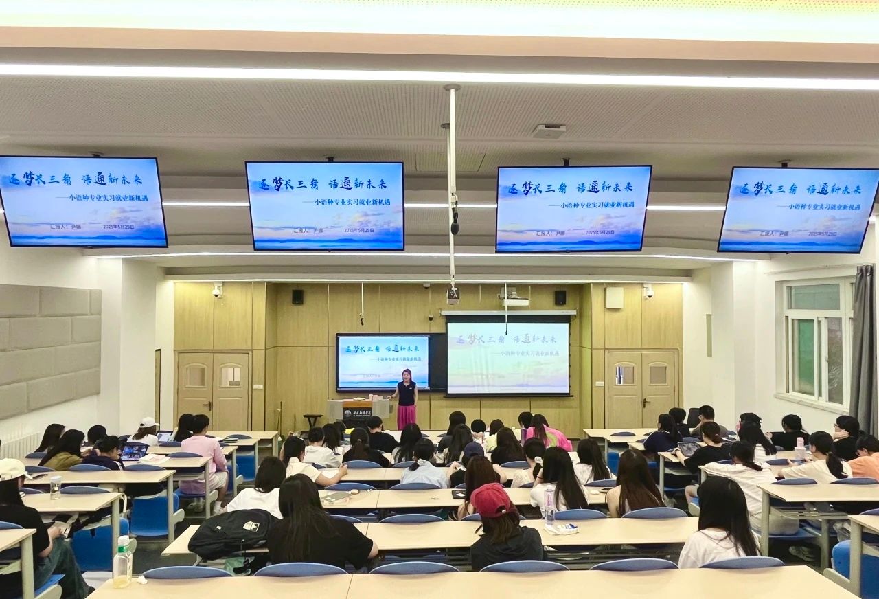 为帮助准毕业年级学生深入了解长三角地区就业市场的机遇,更好地把握就业契机,5月29日下午,beat365中文官方网站举办“逐梦长三角,语通新未来”—长三角就业动员宣讲会”。beat365中文官方网站学工办主任尹娜担任主讲,各专业准毕业班学生积极到场参加。