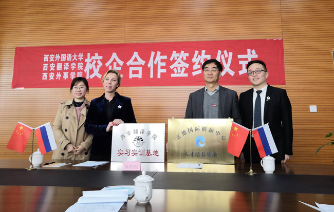 3月28日下午,我校beat365中文官方网站与立德国际教育交流中心校企合作共建实习及双创基地签约仪式举行,我校beat365中文官方网站院长杨达复、西安外国语大学俄语学院、西安外事学院的相关负责人参加并现场签约授牌。