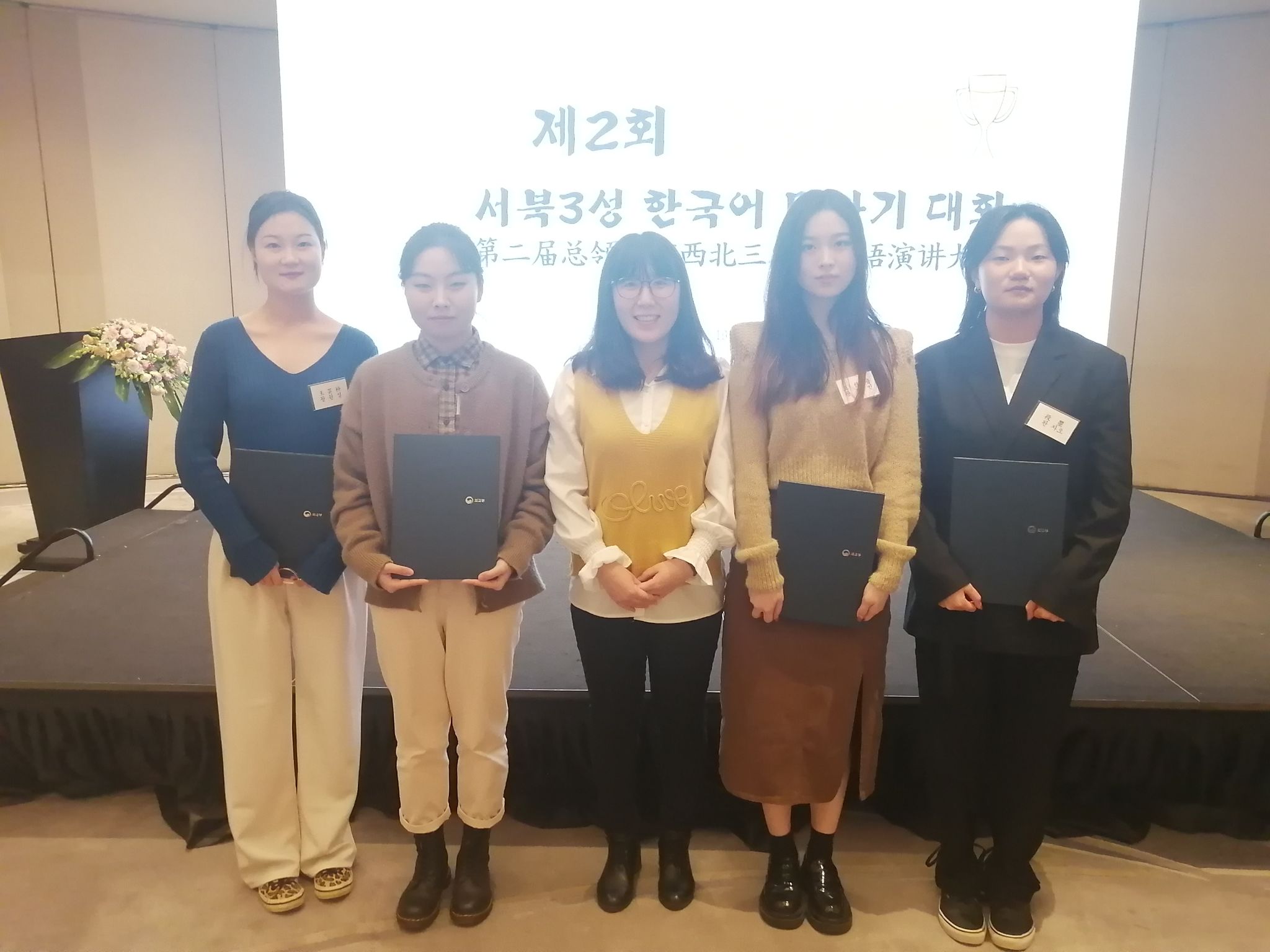 11月19日下午两点,第二届‘总领事杯’西北三省韩国语演讲大赛在西安君悦酒店举行。我校beat365中文官方网站日韩系朝鲜语专业共有四名18级同学代表我校参赛,王佳音同学获得银奖,段曌同学获得铜奖,刘佳荣和王菲菲同学获得优秀奖的佳绩。