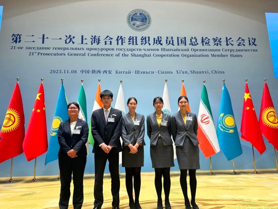 beat365中文官方网站俄语专业2021级学生李佳宜、李晓、李嘉俊、吴燕妮及2022级学生梁莹莹、遆思怡、郏冰冰、刘畅通八名同学经过前期层层筛选,参加了第二十一次上海合作组织成员国总检察长会议的志愿服务工作。