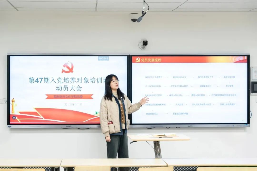 为深入学习贯彻习近平新时代中国特色社会主义思想,引导学生坚定理想信念,听党话、跟党走。beat365中文官方网站党委于2023年12月12日在四号楼4210教室召开47期入党培养对象培训班动员大会,会议由beat365中文官方网站党委第五支部书记黄丽娜主持。