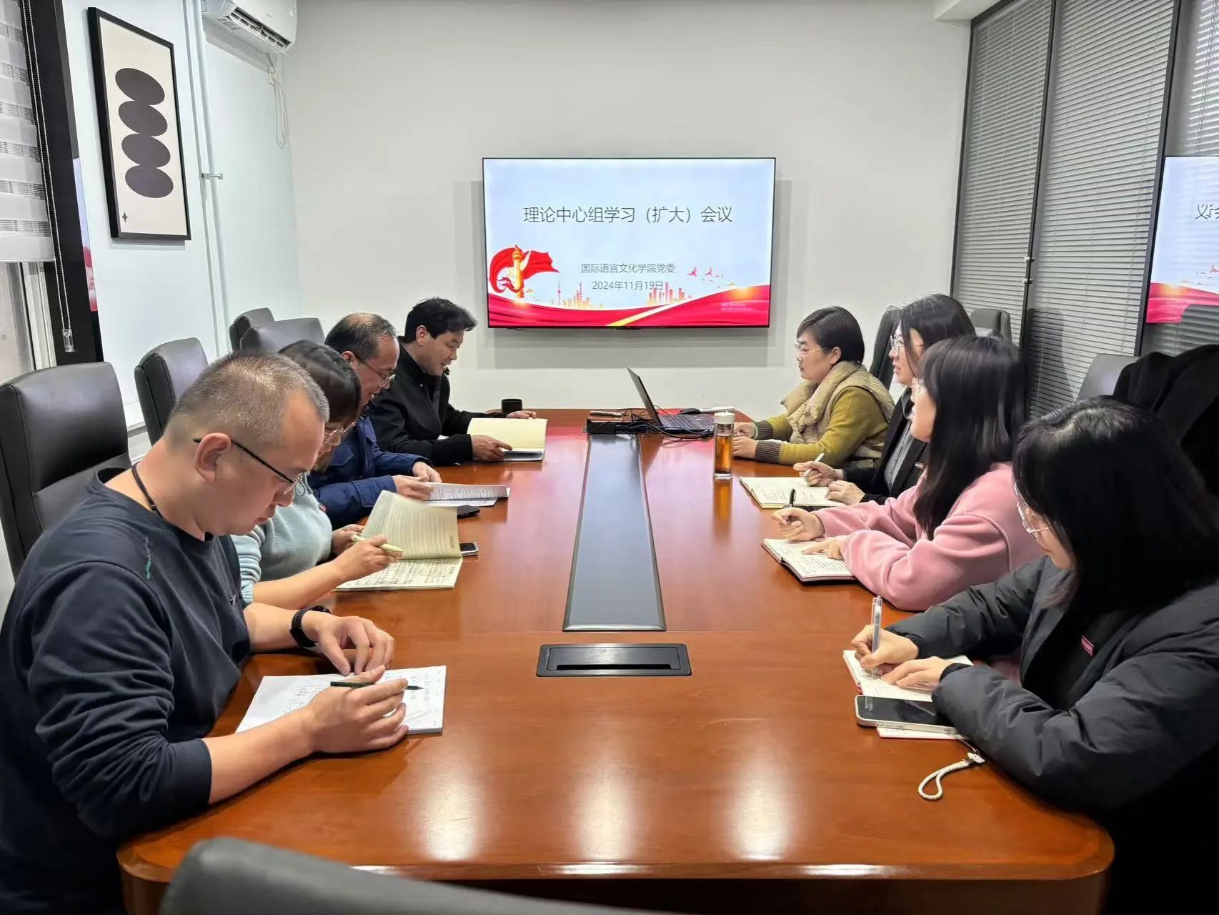 11月19日下午,beat365中文官方网站党委召开理论中心组学习(扩大)会议,学院领导班子,党委委员和师生党支部书记参会。党委书记宇文永康主持会议。