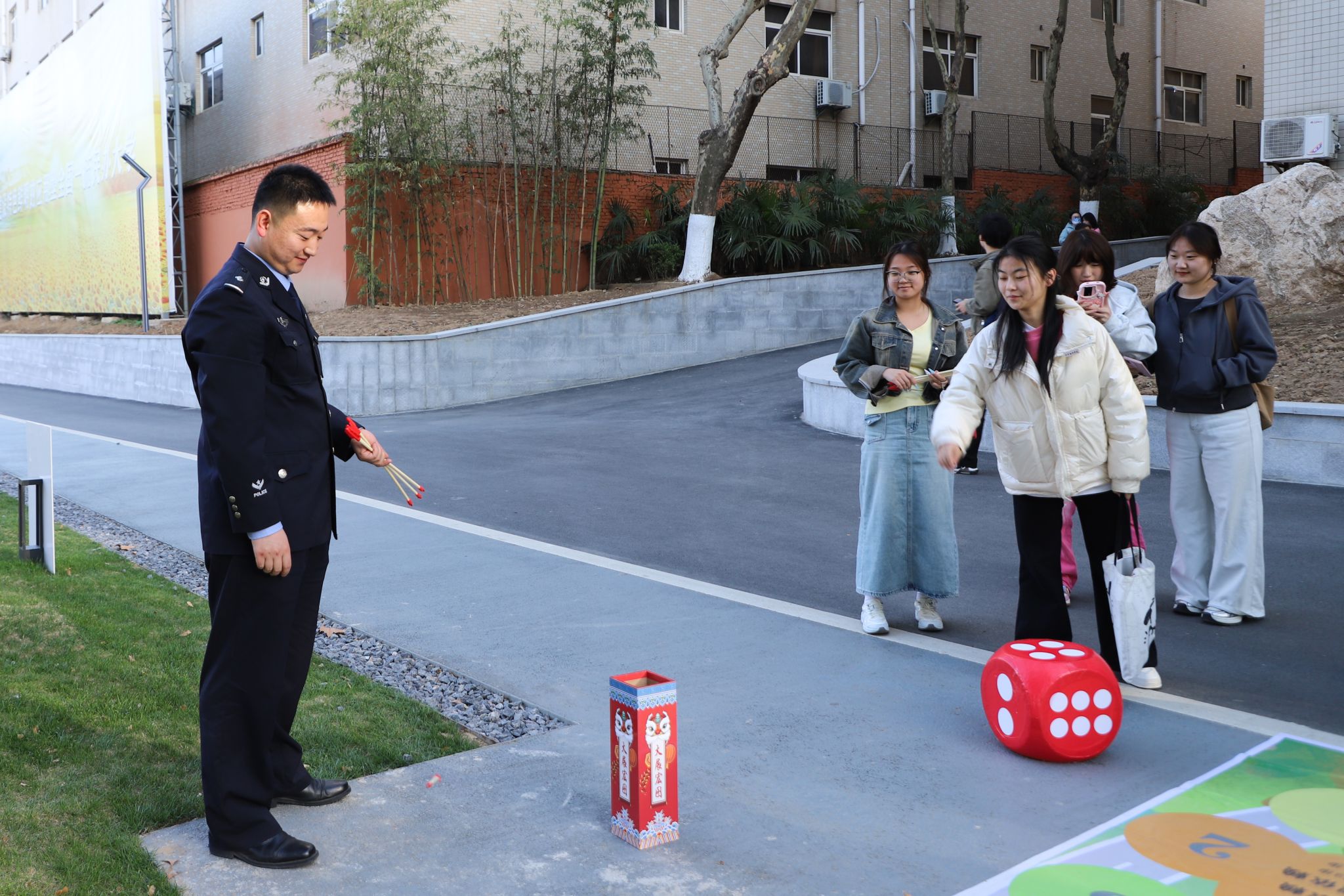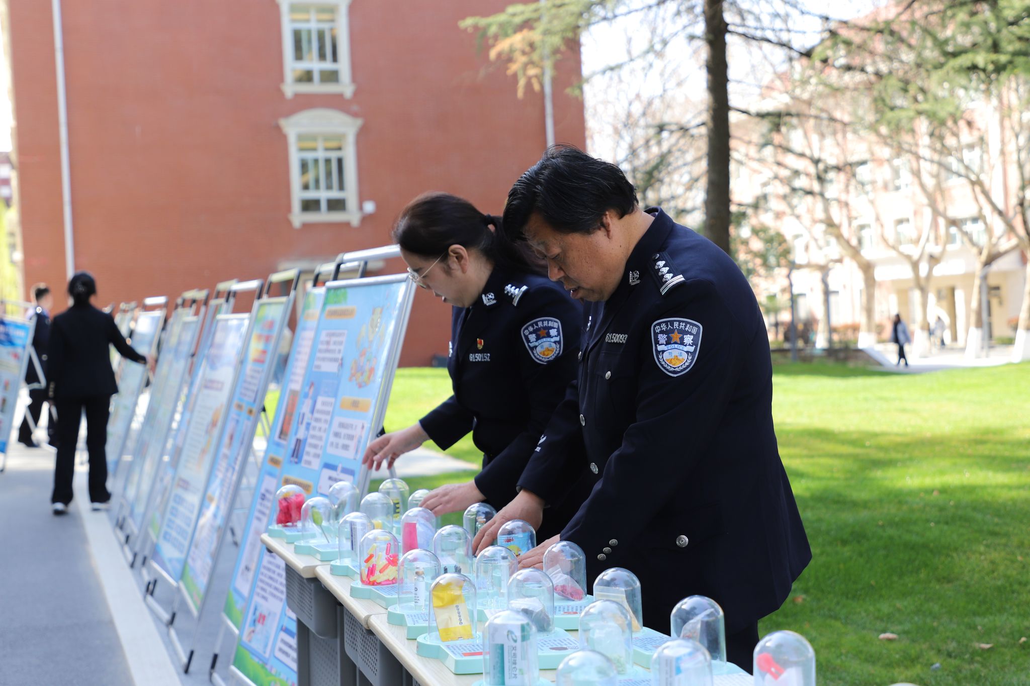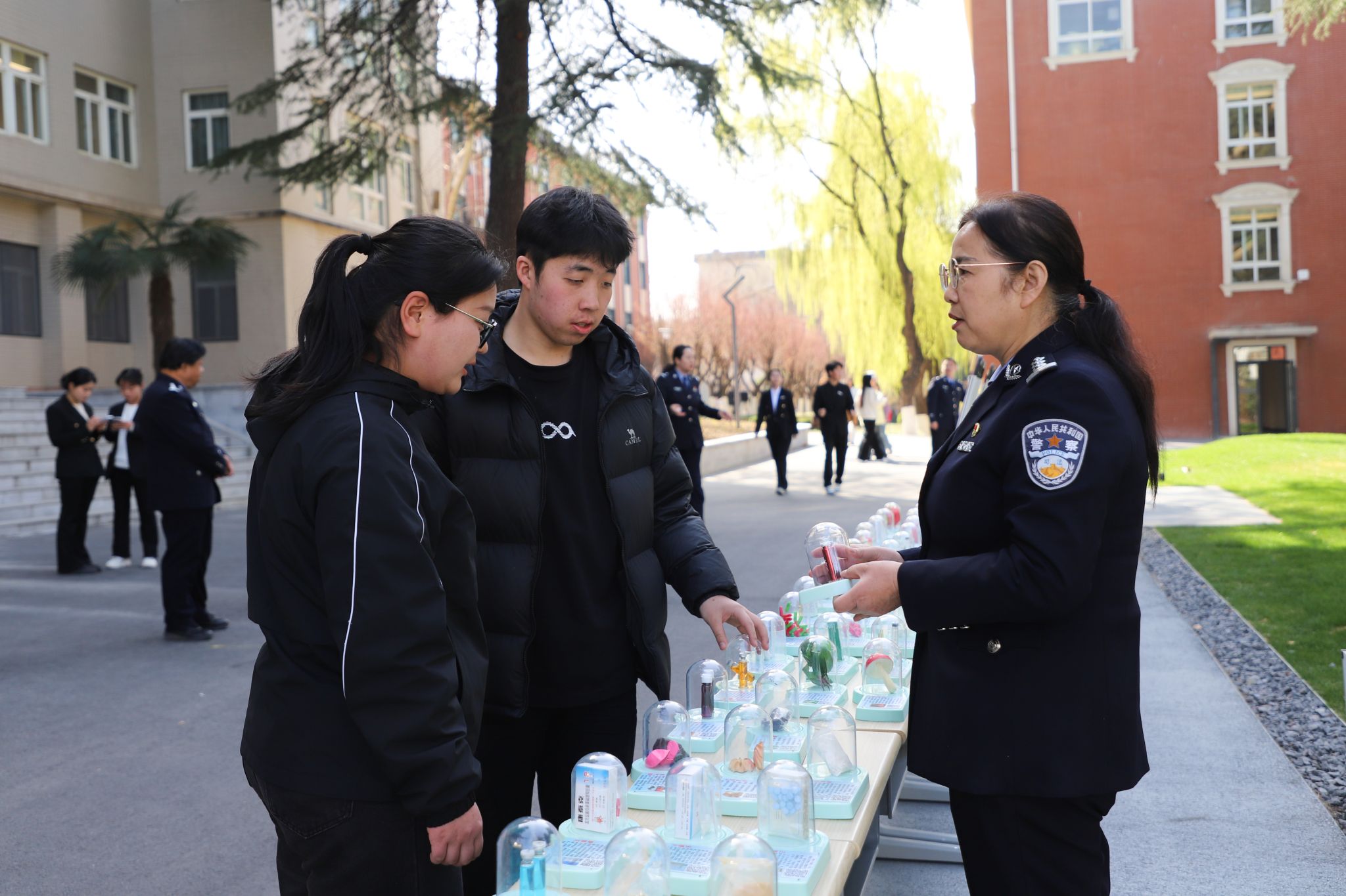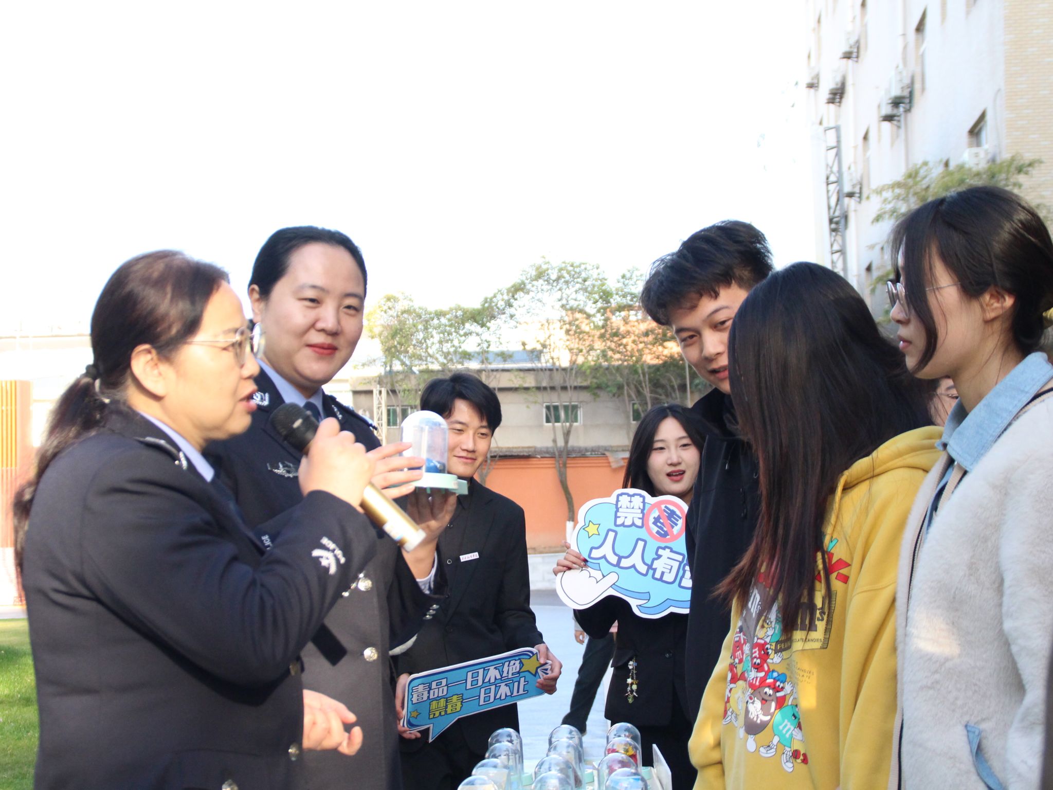 宣讲团的警长们在四号楼门前,进行仿真毒品模型展示与解说。