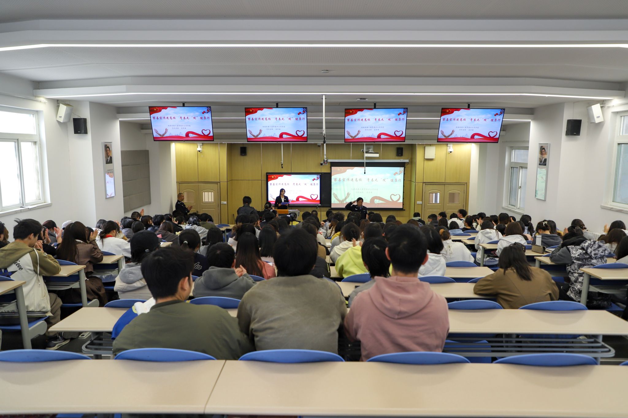 在当今社会,毒品不断变换着“伪装”,新型毒品常常以看似无害的模样出现在年轻人的生活圈子里,极具迷惑性。与此同时,艾滋病的传播形势也不容乐观,其中部分传播途径与毒品使用、不良生活行为紧密相关。年轻人由于好奇心旺盛、社会经验不足,更容易成为毒品与艾滋病的潜在受害者。我们急需行动起来,打破这两大“恶魔”的威胁。为了进一步深化高校学生对毒品危害的认识,引导健康的生活方式,远离毒品,预防艾滋病,增强防范意识。3月20日,我院特邀陕西省虢镇强制隔离戒毒所“秦之蓝”禁毒法治宣讲团来到我们校园,开展“无‘烷’防‘艾’齐宣传,青春无毒逐梦行”禁毒防艾主题教育活动。