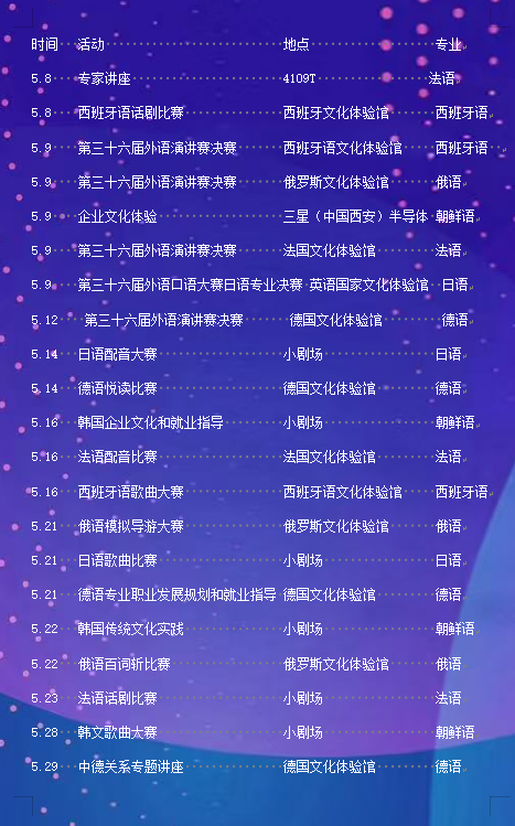 “展语言之美 树文化自信”beat365中文官方网站第四届多语种文化艺术节将于西区五号楼广场开展,本次艺术节各专业活动具体位置如下: