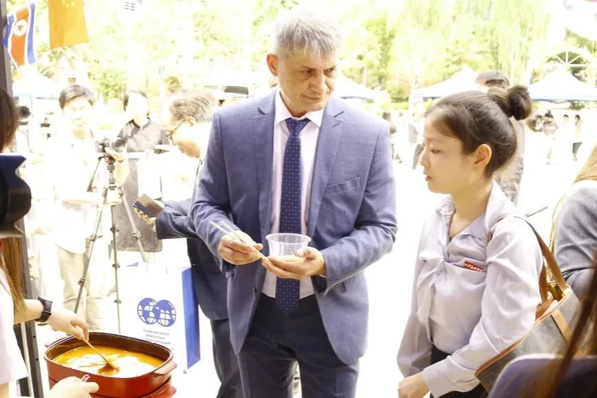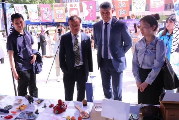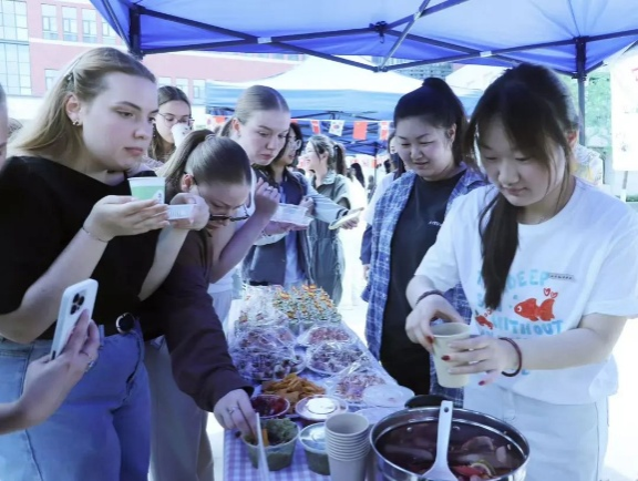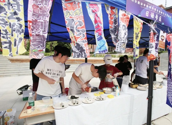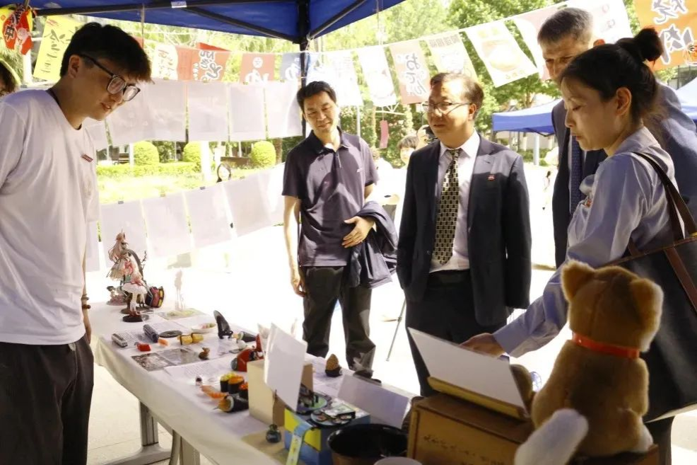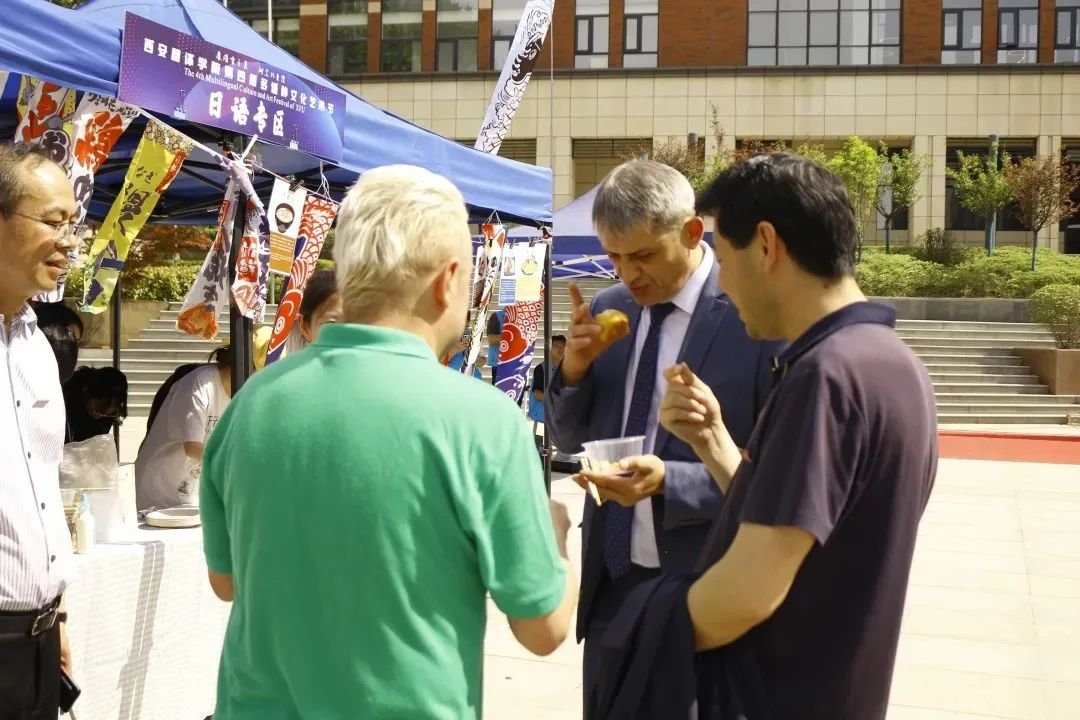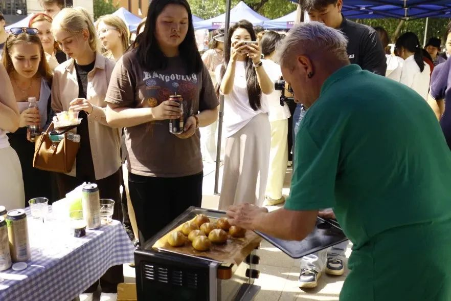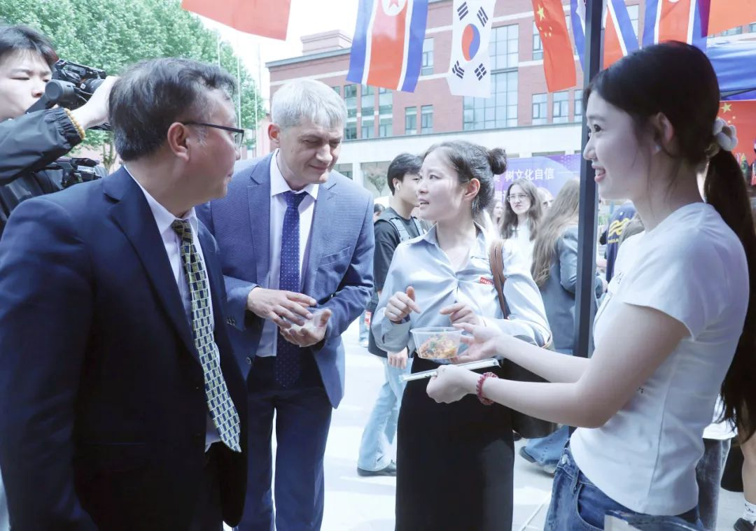 活动来到室外文化体验区,领导们品尝由学生亲手制作的各国特色美食。从精致的日式和果子、到香气四溢的卷饼,碱水面包。每一道美食都承载着不同国家的饮食文化,展现出学生们对各国文化的深入理解与实践成果。室外场所还设置了多语种展示、传统技艺体验等多个展区,丰富的活动内容吸引了众多师生驻足参与,现场学术氛围与文化气息交融,充分彰显了beat365中文官方网站在推动多语种教育与文化交流方面的积极探索与卓越成效。