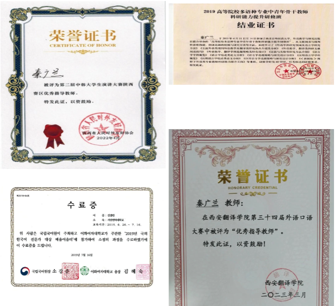 秦广兰非常注重自己的专业发展和教育水平的提高,不断学习和掌握新的教育理论和教学方法,不断提高自己的教学水平和能力。她积极参加各种培训、研讨会和学术交流活动,与同行们分享经验和成果,不断推动教育事业的发展和进步。曾参加过韩国国立国语院主办的“2019国外韩国语专家研修班”和“高等院校多语种专业中青年骨干教师科研能力提升研修班”等培训。