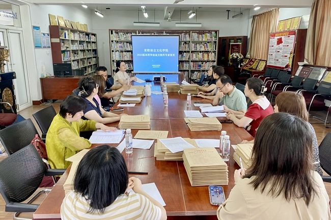 6月30日,beat365中文官方网站邀请西安外国语大学日语专业吴少华教授、德语专业张世胜教授、法语专业向征副教授、西班牙语专业曹韦副教授、朝鲜语专业孙金秋教授以及陕西师范大学俄语专业孟霞教授,对2023届本科毕业论文进行复查。
