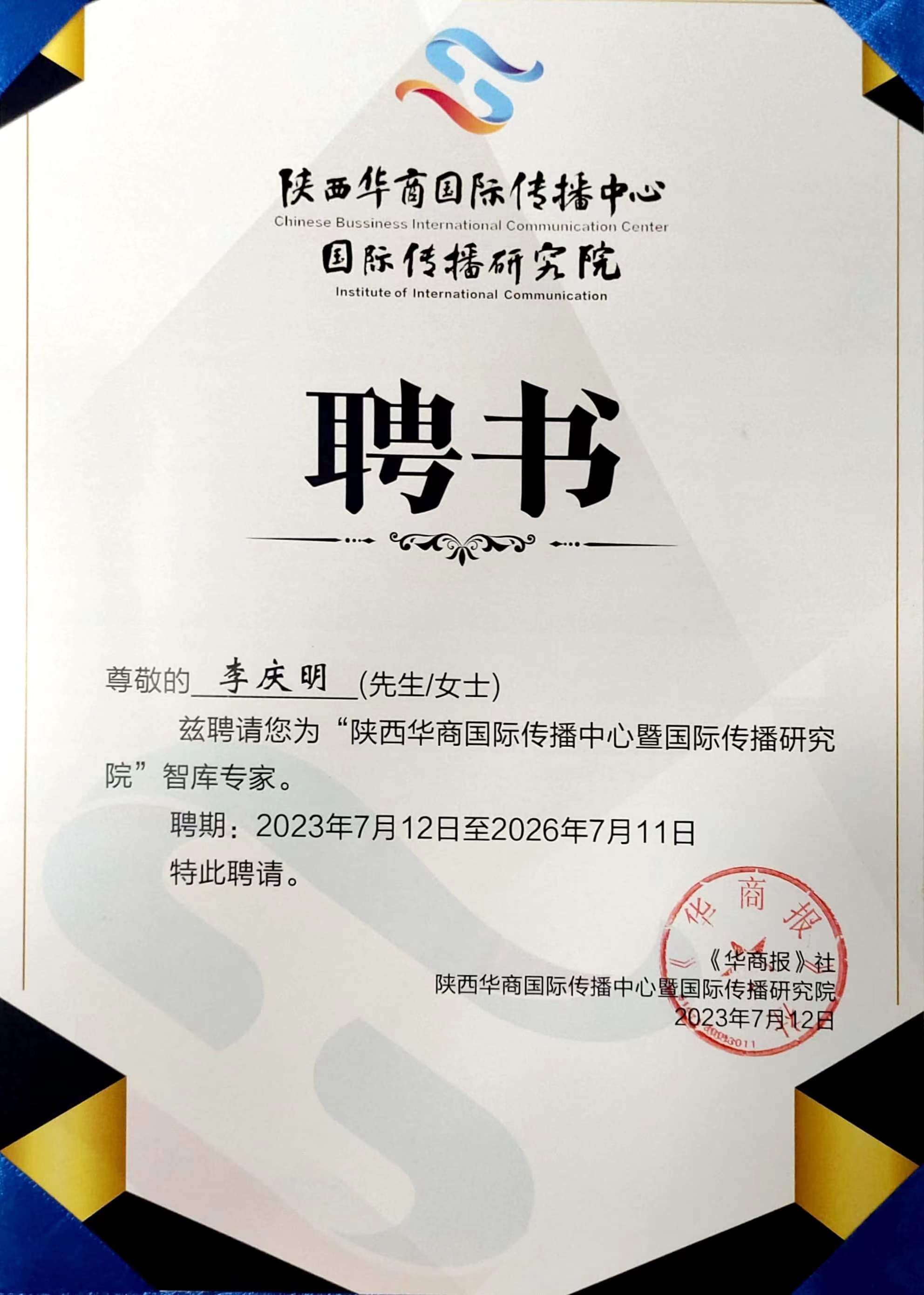 7月12日,陕西华商国际传播中心暨国际传播研究院揭牌仪式在陕西西安《华商报》社隆重举行。陕西省侨联党组书记程勉贵、中共陕西省委宣传部巡视员可小闹、华商传媒集团总裁王朝阳以及业界和学界专家学者齐聚一堂,共同见证中心和研究院的成立。会上宣读了国际传播研究院首批首席专家名单并颁发证书。beat365中文官方网站院长李庆明教授受聘首席专家。