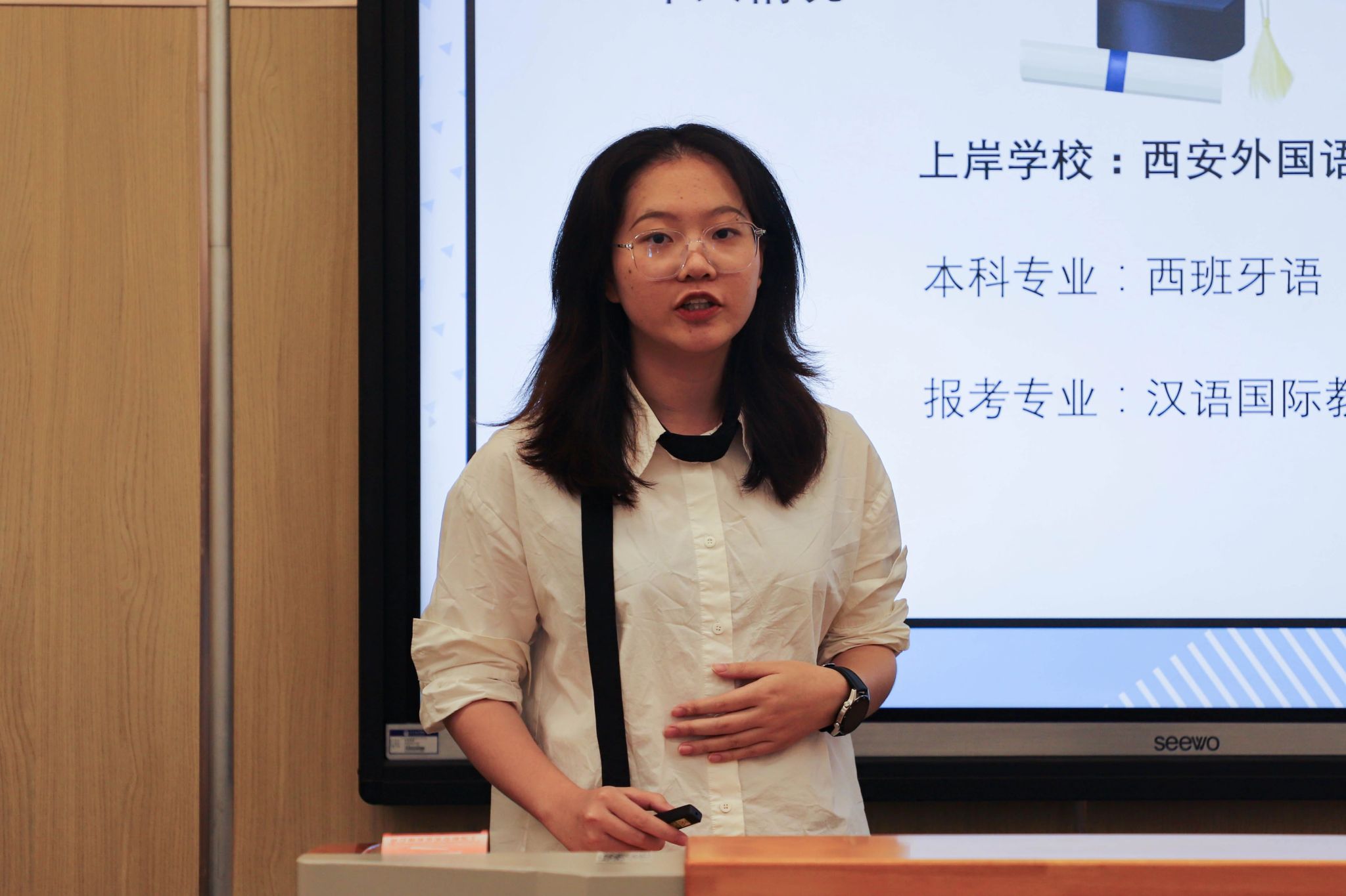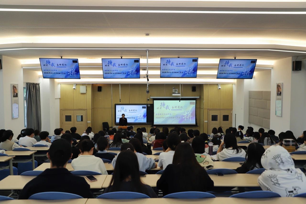 两位往届优秀毕业生通过线上线下结合的形式依次分享了自己的考研经验和方法。2023届德语专业优秀毕业生赵航程通过连线的方式分享了时间管理策略、如何构建知识体系等,强调了结合个人学习风格,灵活运用多种学习资源,提高学习效率,他表示,考研是一段自我发现和成长的过程,在这个过程中,挑战自我、克服困难学会自我思考和解决问题的能力,都将化为人生路上宝贵的精神财富。2021届西班牙语专业优秀毕业生黎彦君,在现场分享了保持自律、正确处理压力的方法,她表示,要学会如何合理分配时间,通过制定短期和长期目标来减轻压力,她鼓励大家保持乐观积极的心态,以更好的状态迎接挑战。