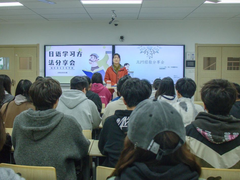 活动伊始,黄丽娜介绍了本次分享会的目的和意义,强调了班级凝聚力的重要性以及学习氛围的营造对于学生个人成长和班级整体发展的积极影响。随后,两位优秀学生代表依次上台进行经验分享,讲述自身学习经验与心得体会。她们鼓励学生们利用在线资源和应用程序来辅助学习,通过听日语歌曲、观看日语电视剧等方式提高日语听力和口语能力。同时,其着重讲述了学习方法的重要性,强调了实际的交流是检验学习成果的最好方式,也是提升语言运用能力的有效途径,激励学生找到适合自己的学习方法,从而达到事半功倍的效果。