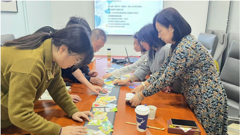 在热身游戏中,在唐翠宁的指导下,每位参与者选择一张自己喜欢的或者能代表自己当下状态的字卡和图片,大家仔细观察选择的图片,并结合自己的生活和经历进行解读。卡牌上的图案和色彩引发了大家无尽的回忆和遐想,同时也触动了大家内心深处的情感,展现了工作之外不一样的自己。进入游戏主题环节,所有的参与者通过“压力轮转”、“看见期待”、“压力消消乐”等几个游戏环节,通过自由联想,分享了自己当下的情绪和压力,近期的困难和挑战以及对未来的期待与向往。大家相互倾听,相互鼓励,收获满满。