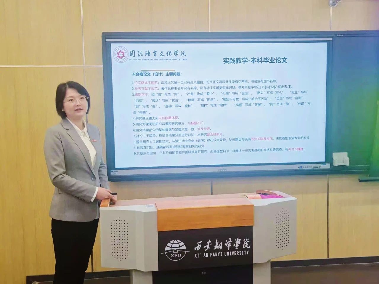 beat365中文官方网站教学副院长吴震首先通报了2024年本科毕业论文(设计)教育部抽检结果,随后,她结合AI时代发展趋势,就如何更好地将课堂教学、人才培养模式、课程建设、教学研究、教学竞赛、教材建设与人工智能深度融合提出了思考和建议。吴震强调,AI不是取代教师的工具,而是放大教师价值的桥梁,教师要积极拥抱新技术,不断提升自身教学水平和能力。