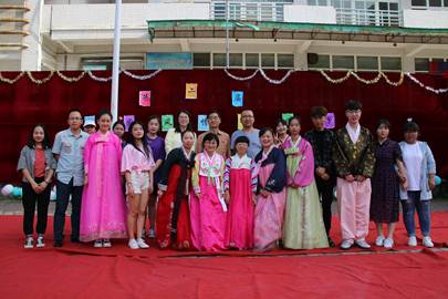 在表演的同时还进行了韩国传统美食品尝、韩服试穿、韩服走秀等多项活动。17级韩语班专职教师邹俊秀向同学们介绍了韩国传统服饰,详细讲解了韩服的组成部分、服饰类型及其历史发展,使同学们深刻了解了韩国文化的独特魅力。