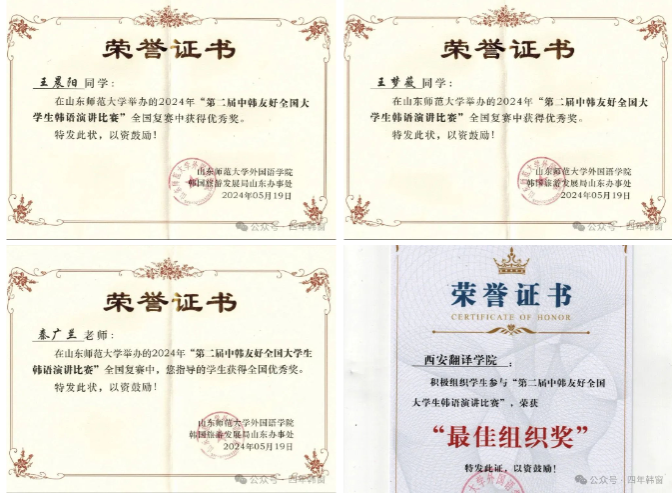 5月19日,由山东师范大学外国语学院、韩国旅游发展局山东办事处主办,韩国学中央研究院协办的第二届中韩友好全国大学生韩语演讲决赛在线上举行。我校获得“最佳组织奖”,朝鲜语专业2022级王晨阳、王梦薇同学获得全国复赛优秀奖。